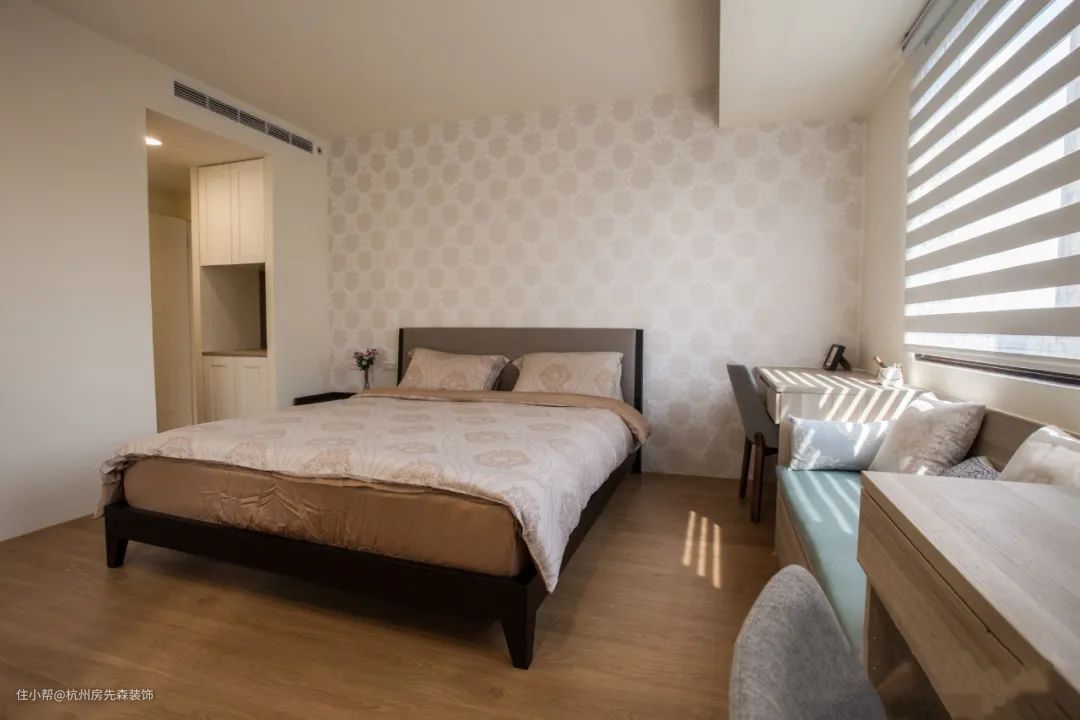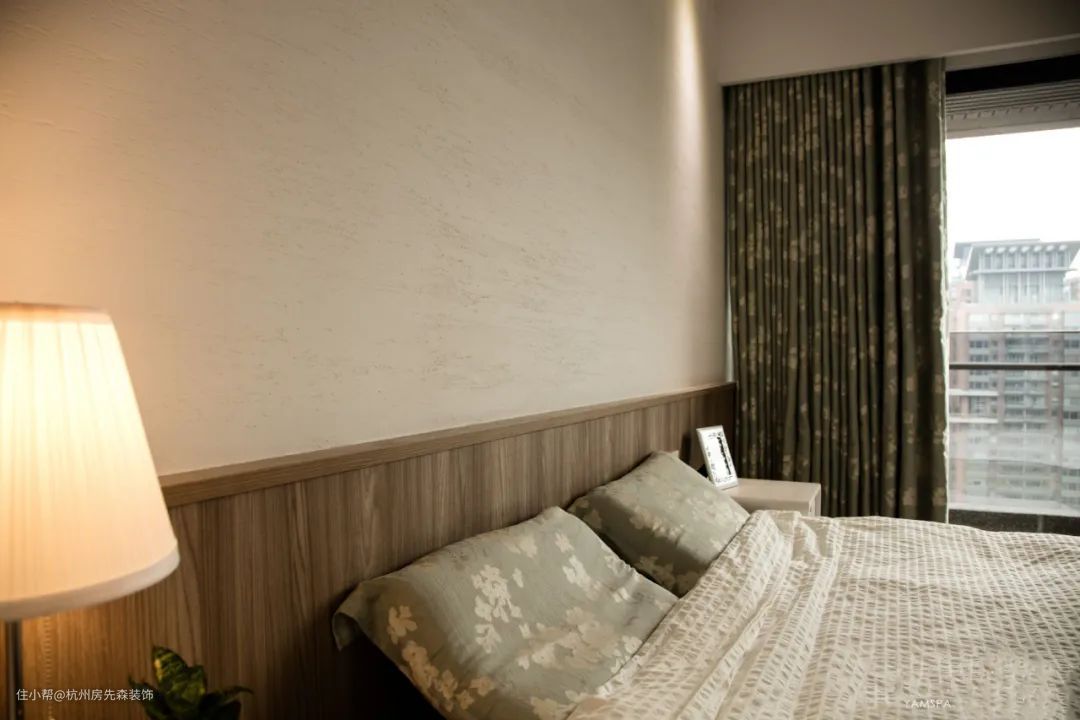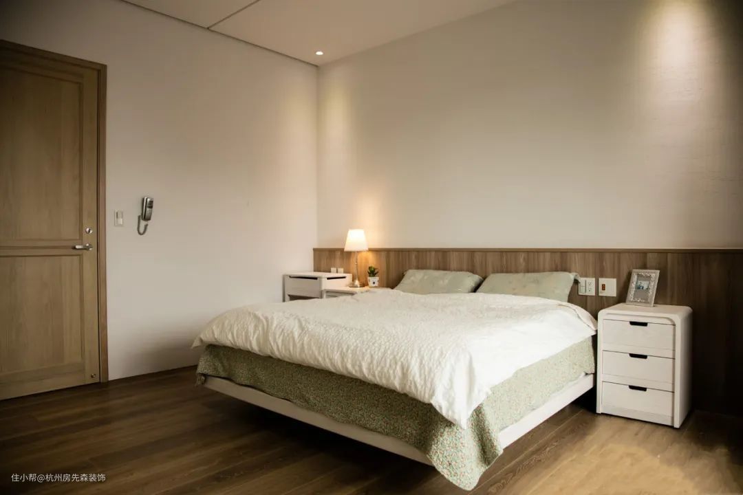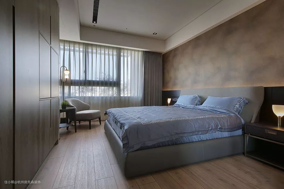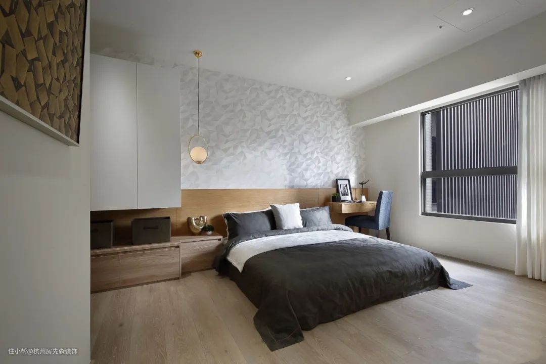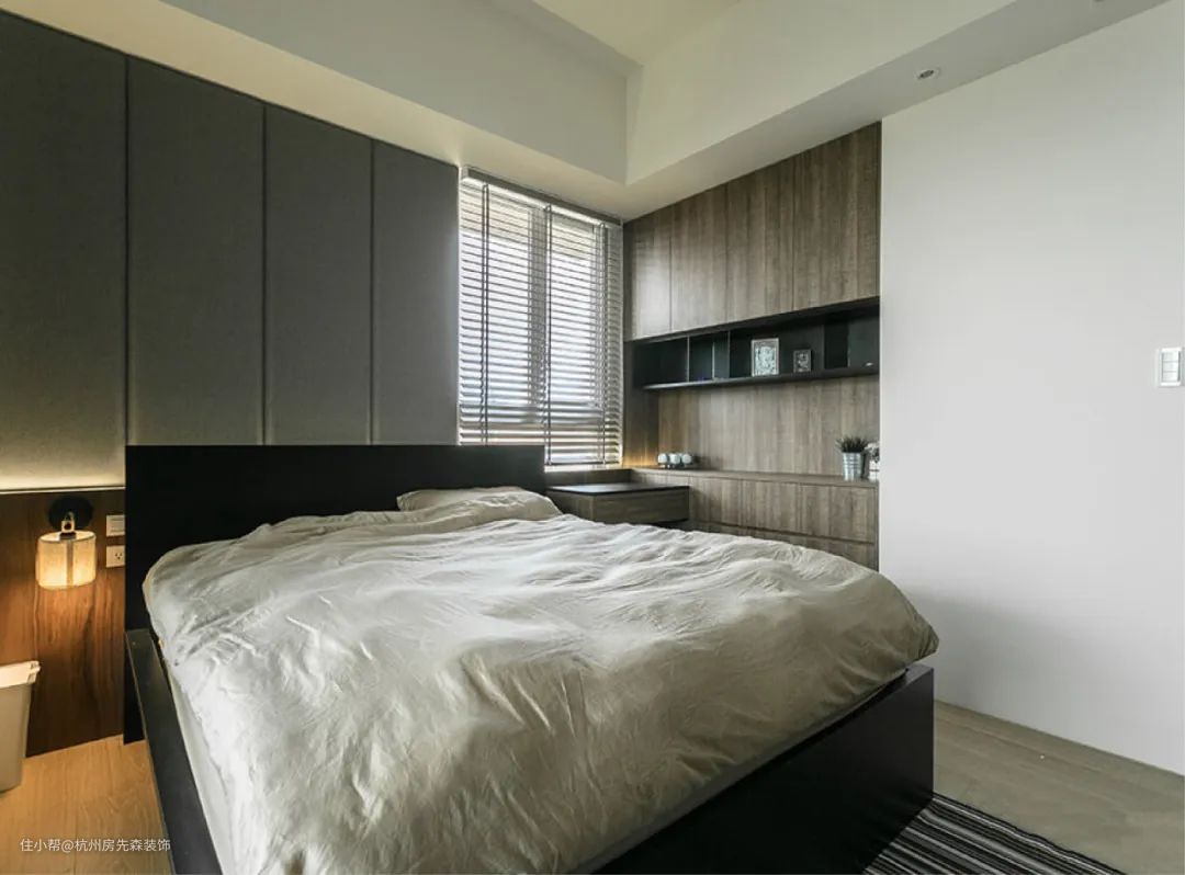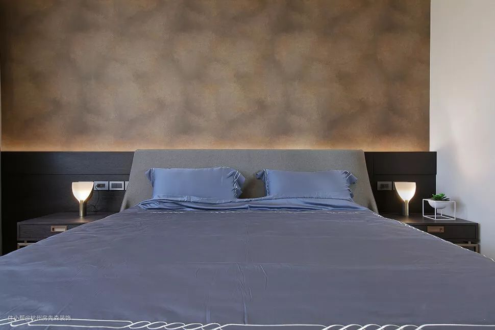 木质调性配色较为稳重,透过床头层板灯设计营造卧室氛围更加分。