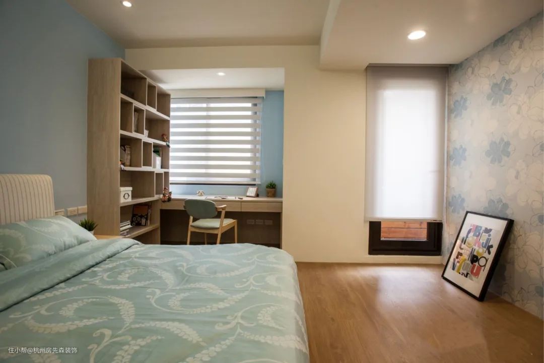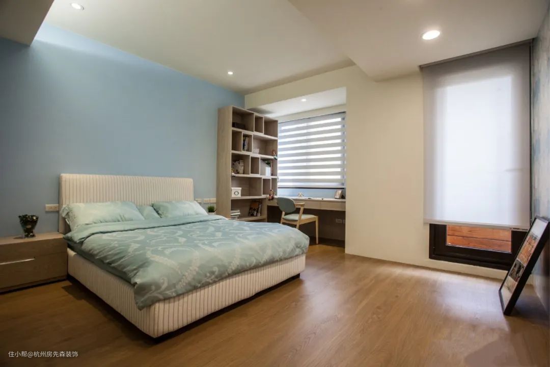 蓝色配置有助于舒缓神经及放松心情,且浅色同时有放大房间视觉效果,使整体空间看起来更加舒适明亮又不会过于活泼缤纷。