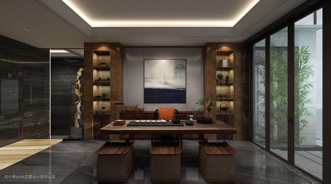 不同于其他空间,茶室的家具选用木材材质,并且背后的石材背景墙两侧也选用了更贴近木材色调的瓷砖,在搭配上紫砂茶壶、白瓷茶具,让空间中充满中式茶道的神韵。茶室的窗户同样选用落地窗,保证这里能有开阔的视野。在落地窗旁边种植了一小片柱子,在中国传统文化中,竹子象征着气节,把它放到茶室中,更能展现出业主高尚的人格。