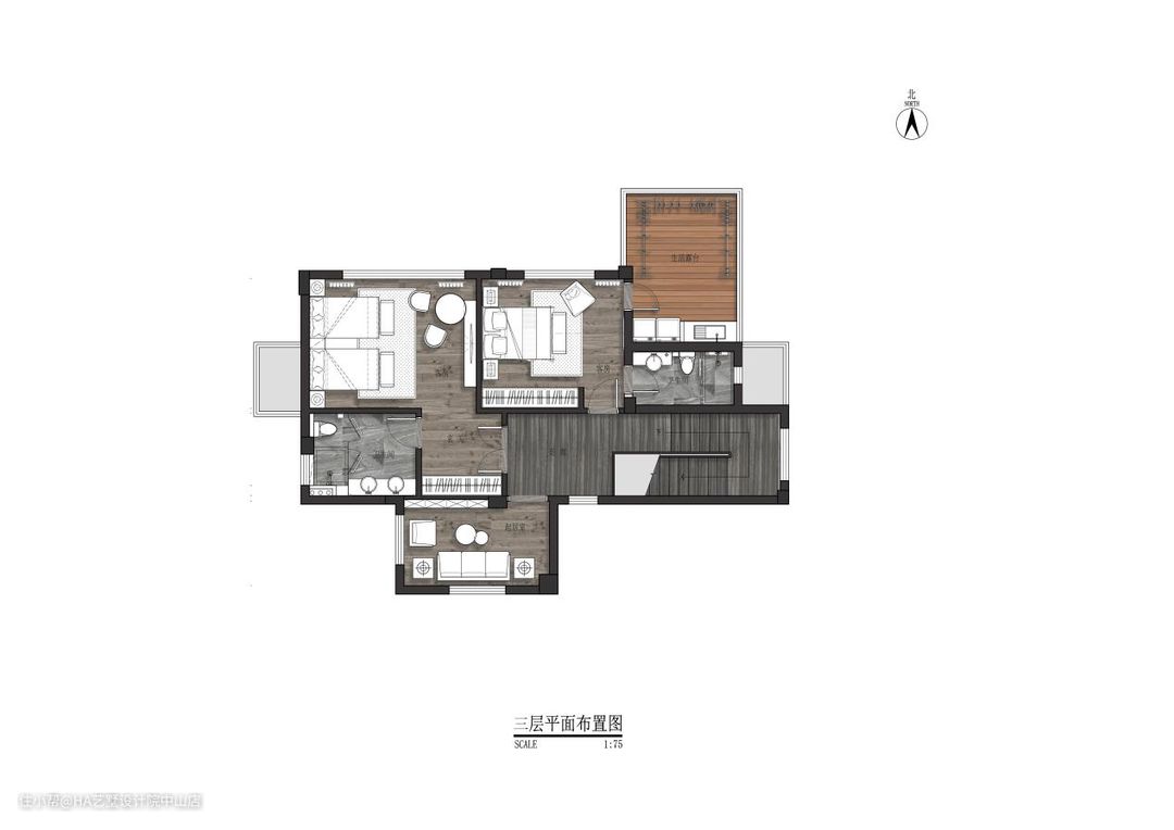 3、第3层空间中设计了一个生活阳台,将洗衣机等物品放置在这里用来清洗和晾晒全家人的衣物,床单,被罩等物品。另外在这一层依旧设计了两间卧室,供业主招待客人使用。