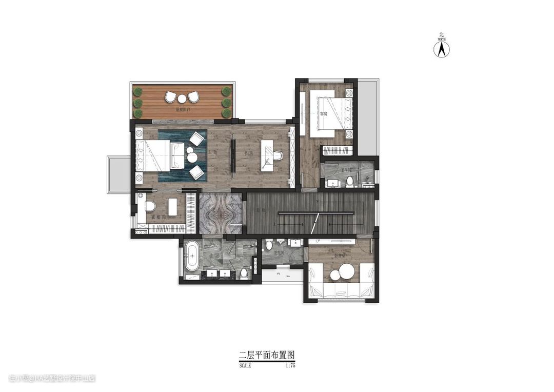 2、二层主要作为业主的生活区,在楼梯左侧设置业主的主卧室。并且按照业主的要求,设置了休闲阳台、衣帽间、主卧卫生间和书房这些区域通过推拉门或屏风的方式分散成不同的功能区域。另外在剩余的空间内还设置了一个供业主休闲的影音室,以及供业主招待客人的客房。