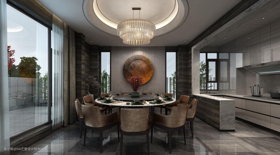 餐厅在开放式的厨房侧面,在造型上,设计了圆形的吊顶搭配圆形的餐桌、吊灯、圆形背景墙装饰,这一系列的圆形设计让餐厅充满了曲线的柔美,空间氛围更柔和,再搭配上柔和的光线和现代、舒适的餐椅,共同营造了一个舒适、温馨、让人放松的用餐环境。
