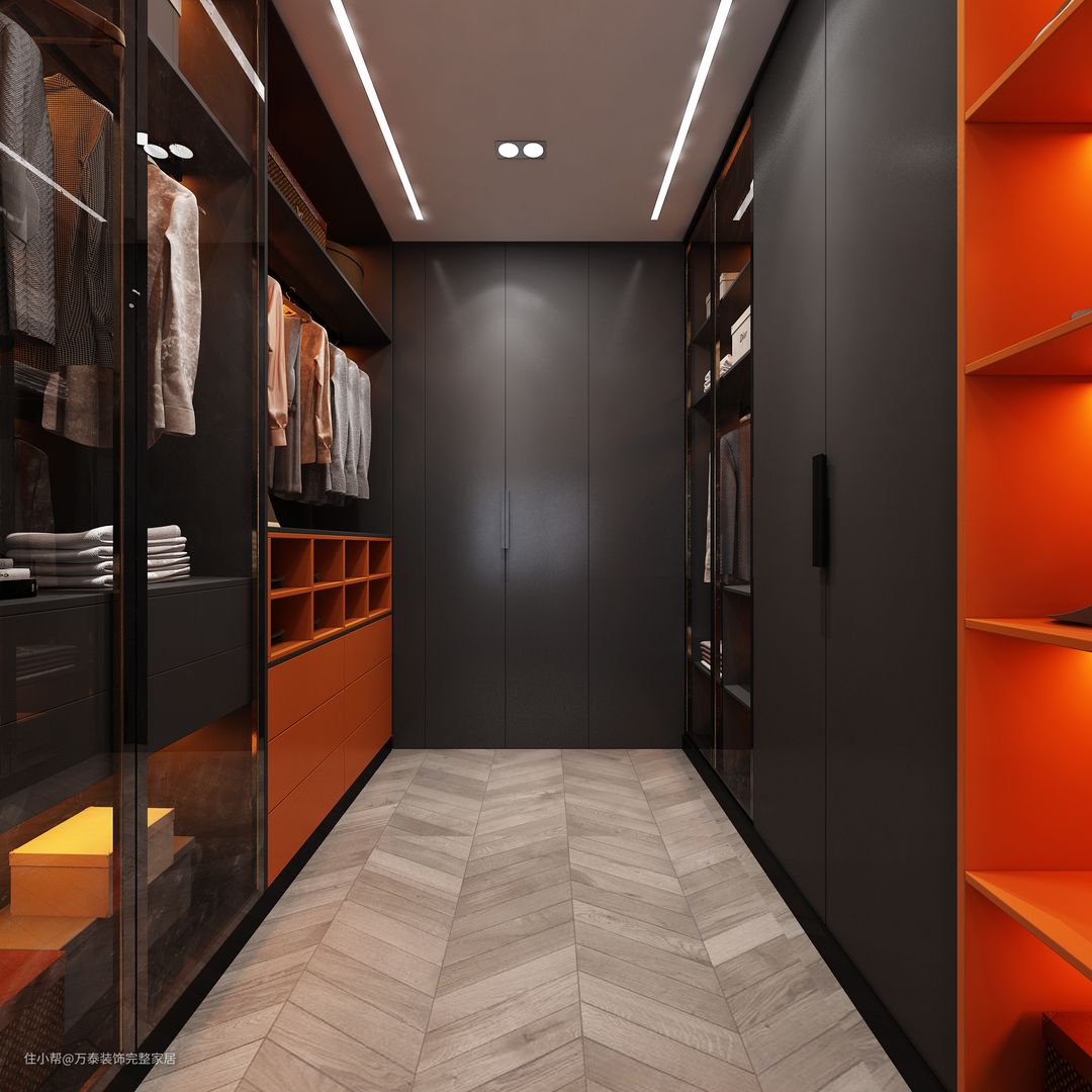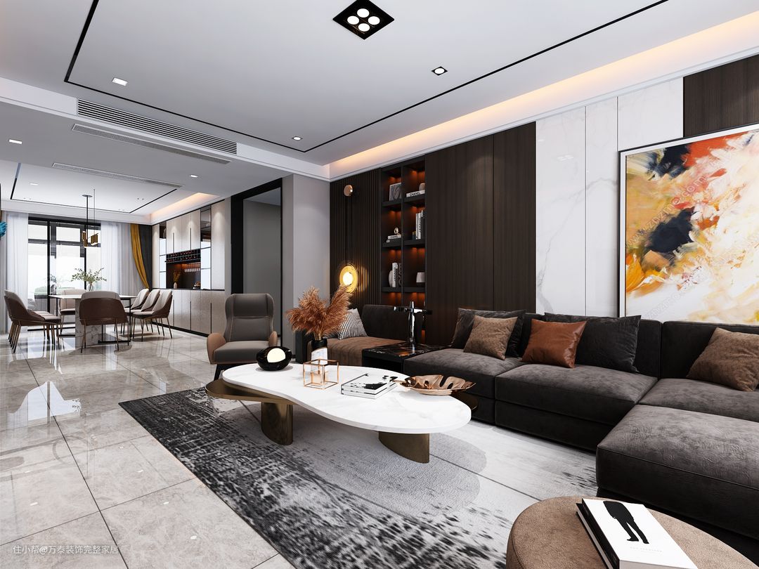 客厅顶面也是做了无主灯设计,板材是深色胡桃木板材,沙发背景墙是做了正面嵌的柜子和展示柜,展示柜用来放置工艺品和平时看的书籍,白色混油板材加深色胡桃木穿插的正面墙柜子会比较有层次感,地面是暖灰色方砖通铺,万泰装饰设计师做的方案客户也是比较满意的
