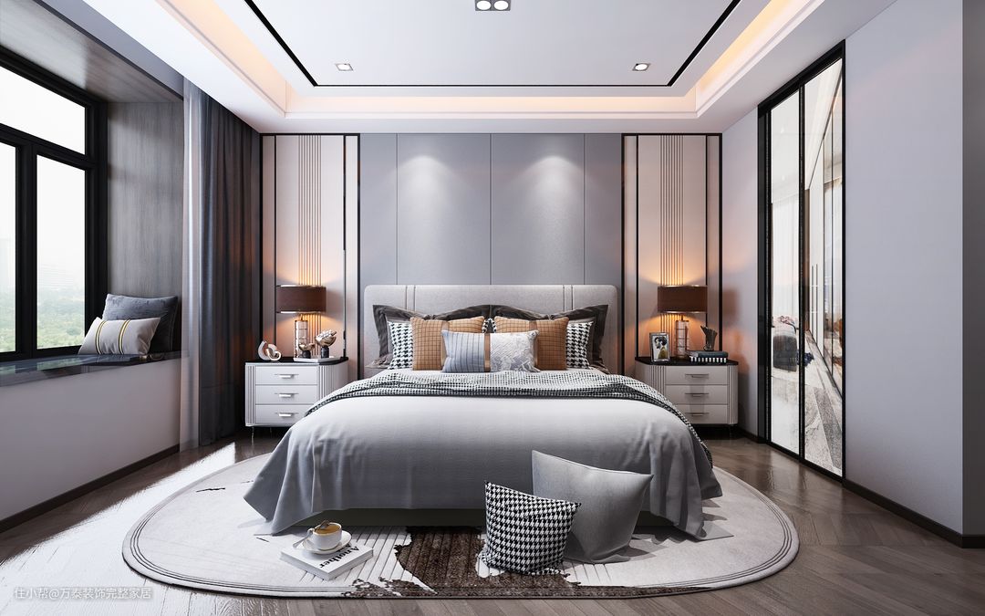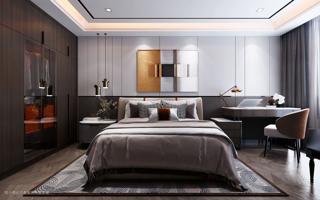 本案位于德州市崇德公馆,面积是220平的大平层,万泰装饰的一位80后设计师给客户设计的,客户比较喜欢现代风格的,主卧室面积比较大配有衣帽间和卫生间,地面都是木地板,深色胡桃木板材会提升整个空间质感