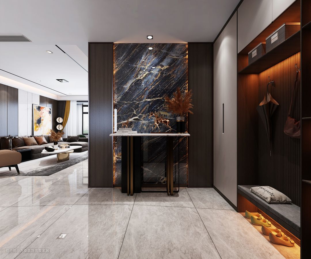 最细换的就是入户玄,两侧隐蔽式灯带打到整块岩板上质感层次感也是特别强,万泰装饰设计师设计的玄关位置客户也是特别的满意