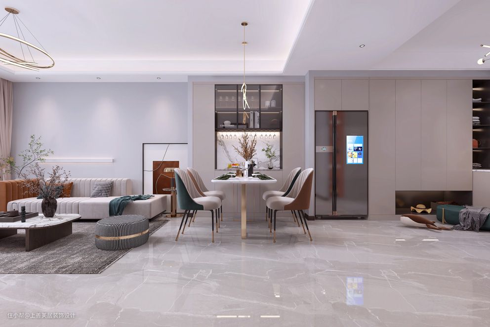 这里是客厅、餐厅、和入户玄关区的平面视觉效果。在空间上,一个一个空间的过度,加上顶面多的走廊吊顶,进行区域的划分。