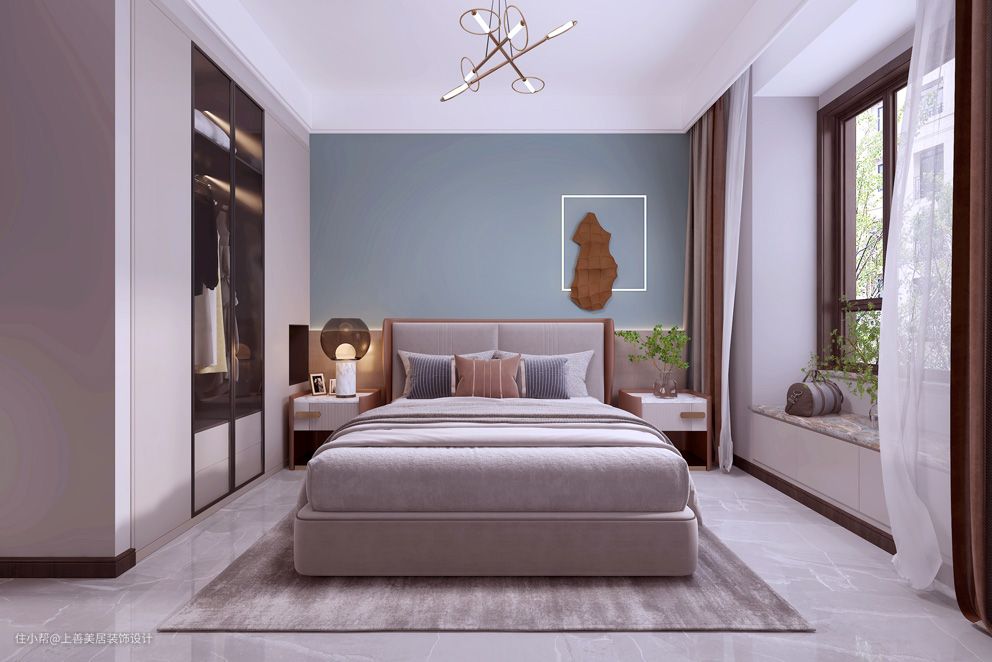 主卧室设计上,飘窗柜的设计是一个亮点,去掉原油的窗台结构,用柜子做了飘窗,有储物功能和观景功能。衣柜做了一半透明玻璃设计,让整个空时空间不压抑。