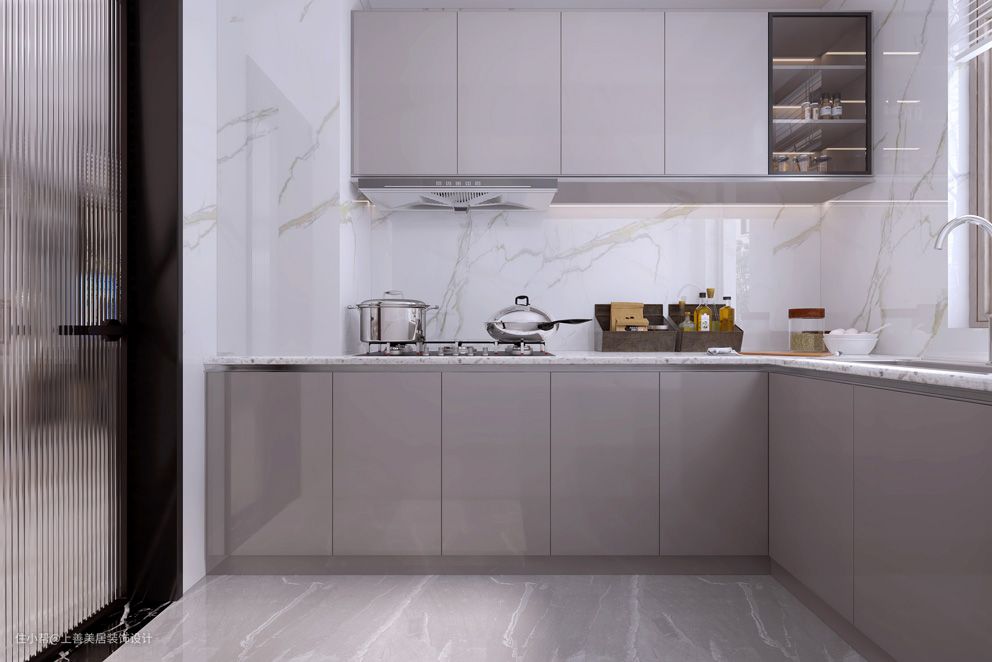 厨房做成了L型厨房,因为厨房面积本身就比较小,所以利用上了每一个空间尺寸,吊柜也坐满。