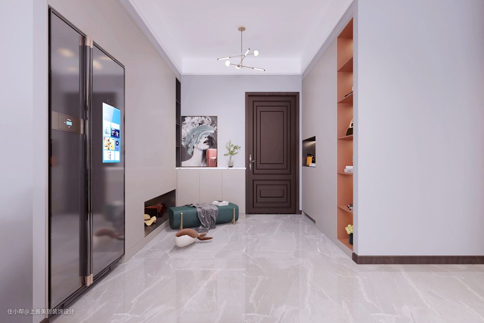 玄关这里,做了矮鞋柜(地暖阀包裹),通顶的鞋柜设计,两侧的鞋帽柜设计,让整个玄关区形成半围合的结构,即是玄关,又是衣帽间。冰箱尺寸内嵌到鞋柜内,整体美观整洁,并且选择的是储物功能抢到的双开门冰箱哦!