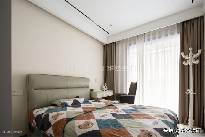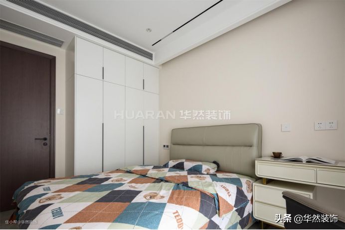 次卧是业主女儿的房间,孩子在国外读书,在家的时间不多,所以房间布置得简单而温馨。和主卧一样,次卧也做了无主灯的设计,一样磁吸灯加筒灯的组合;超长出风口以及通顶衣柜的无把手设计,让空间更利落,也更加美观。