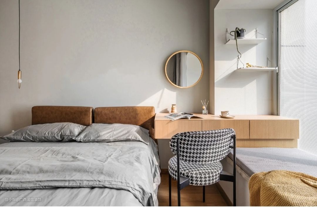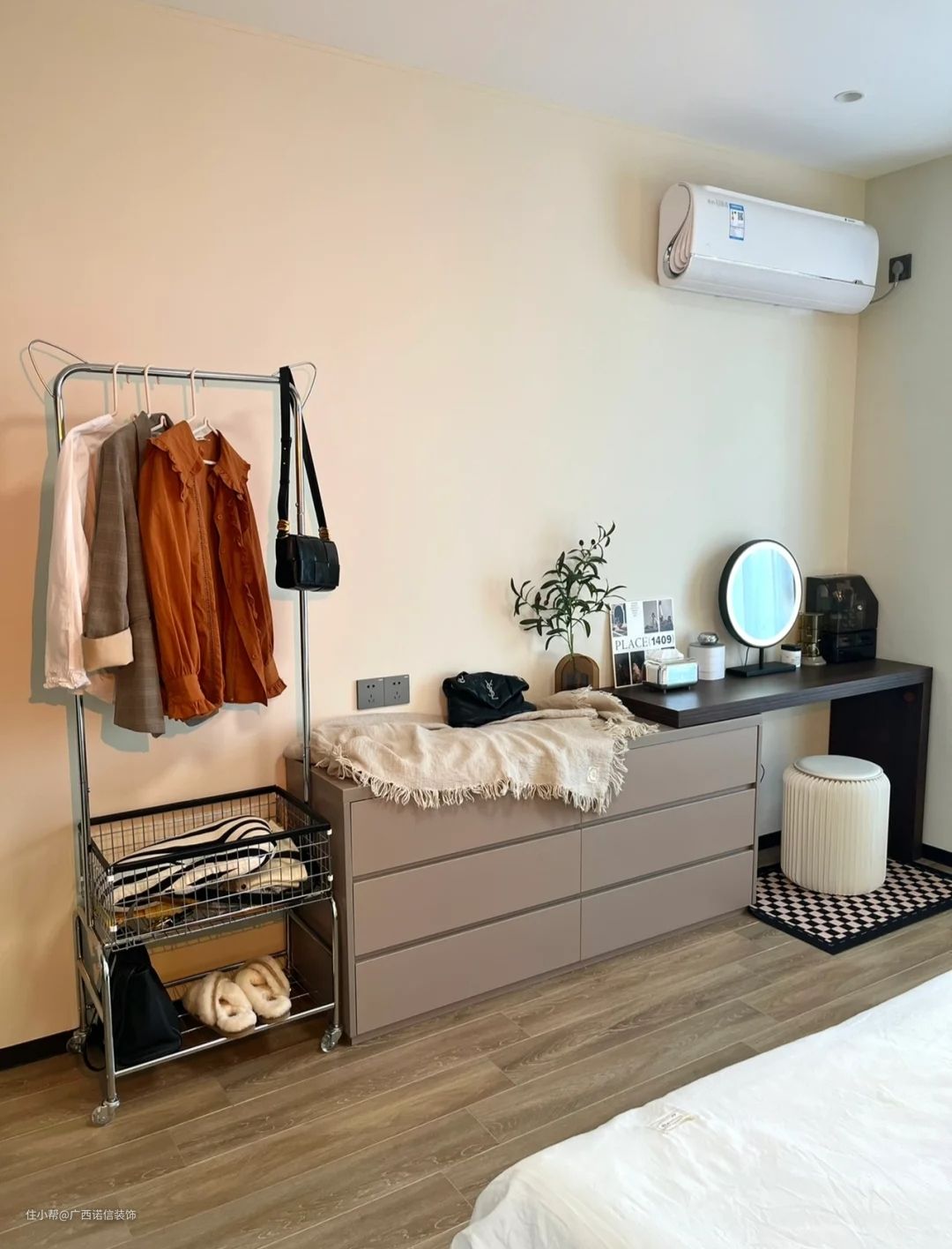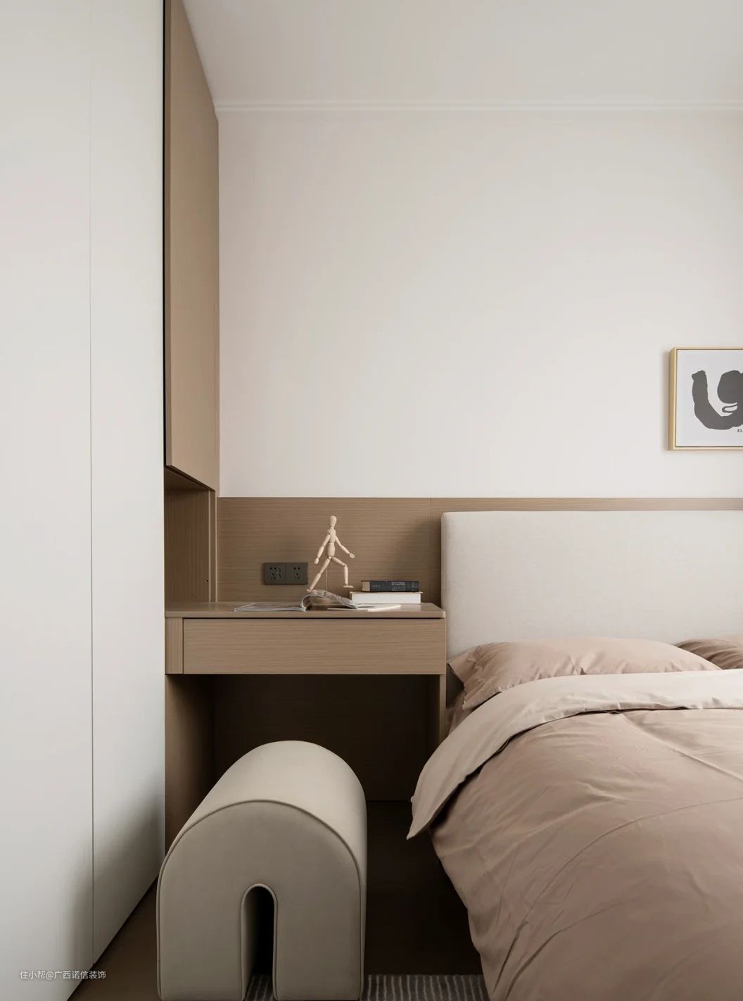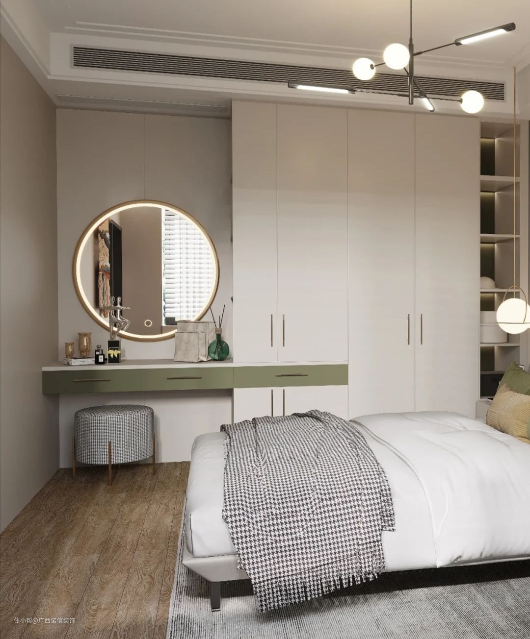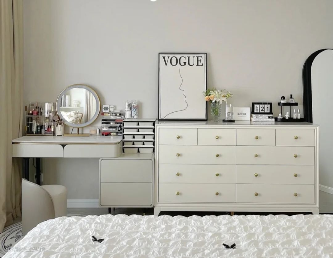 床尾空间足够的情况下,可以考虑梳妆台+矮柜的设计,还自己可以自由搭配,放置衣帽架、脏衣篓等,好看实用。