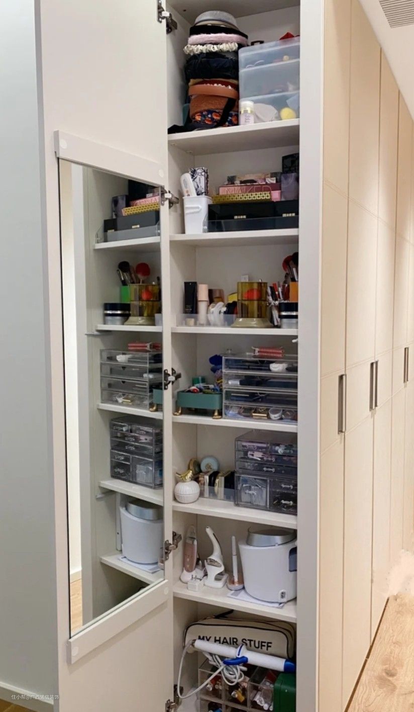 ⊙4、利用衣柜侧面做一个薄柜,作为隐藏的梳妆柜,将收纳用到极致。