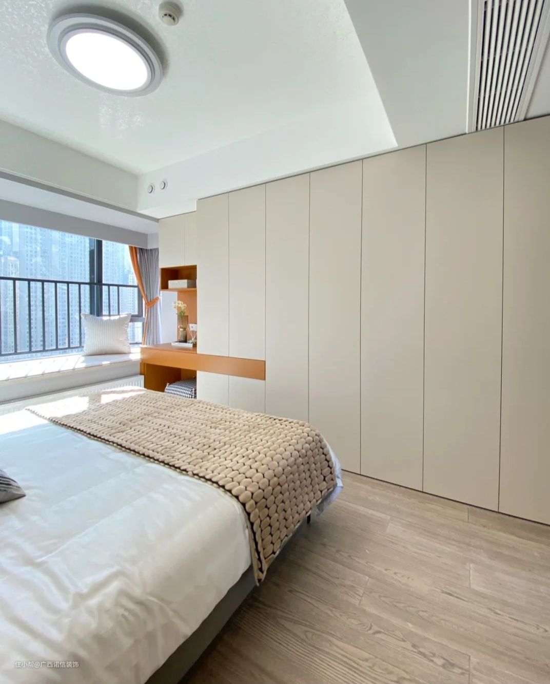 飘窗延伸出来做抽屉+收纳柜或者开放格,既可以当梳妆台,又兼具了床头柜的功能。