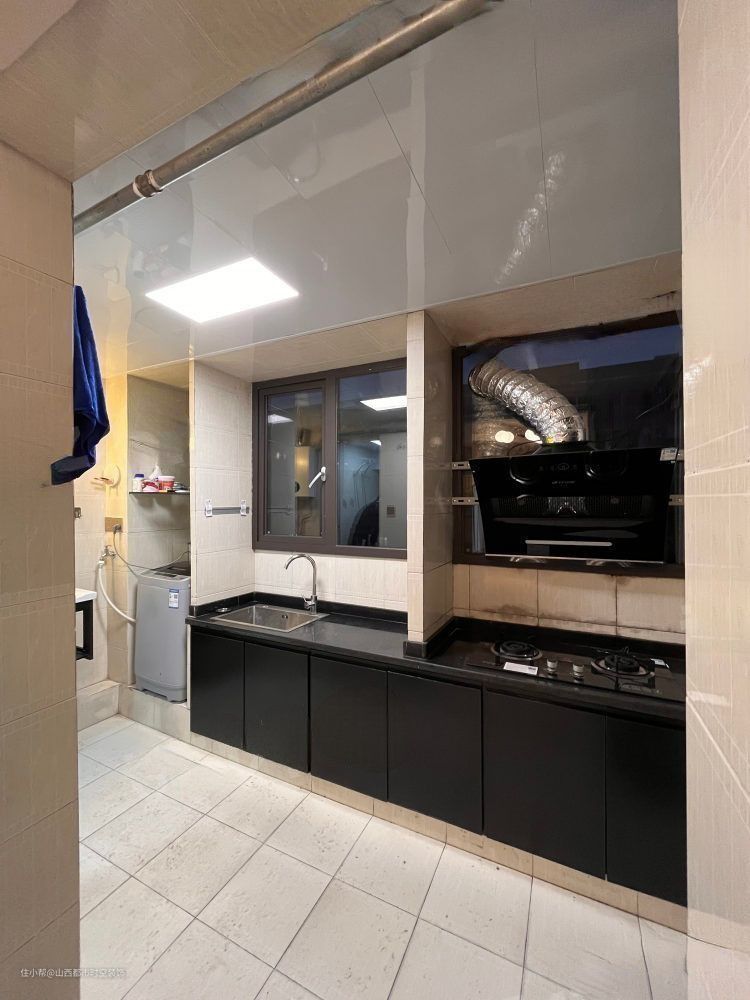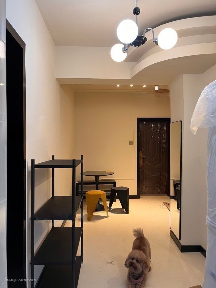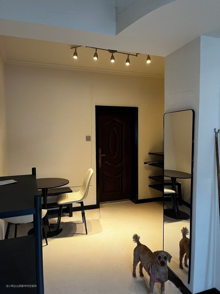大门左边就放了桌子,右边是鞋架。这个灯具是宜家的多头灯,原价399不带灯泡,上咸鱼淘的二手,200带灯泡拿下。右边是鞋架和一个卧室的门,正对门是一堵墙,贴了挂衣服的挂钩。灯光是3000k,墙壁颜色是佐敦1519,实际很好看,选择的全屋搭配是黄黑搭配。桌子凳子,前面两个椅子也是拼多多,后面那个椅子也是淘的宜家二手,50元。后面把这两个凳子扔到房间内书桌了,客厅增加了皮椅。厨房换了吊顶、灶、水槽和抽油烟机,把原来橘色的橱柜门涂成了黑色,黄黑搭配嘛。
