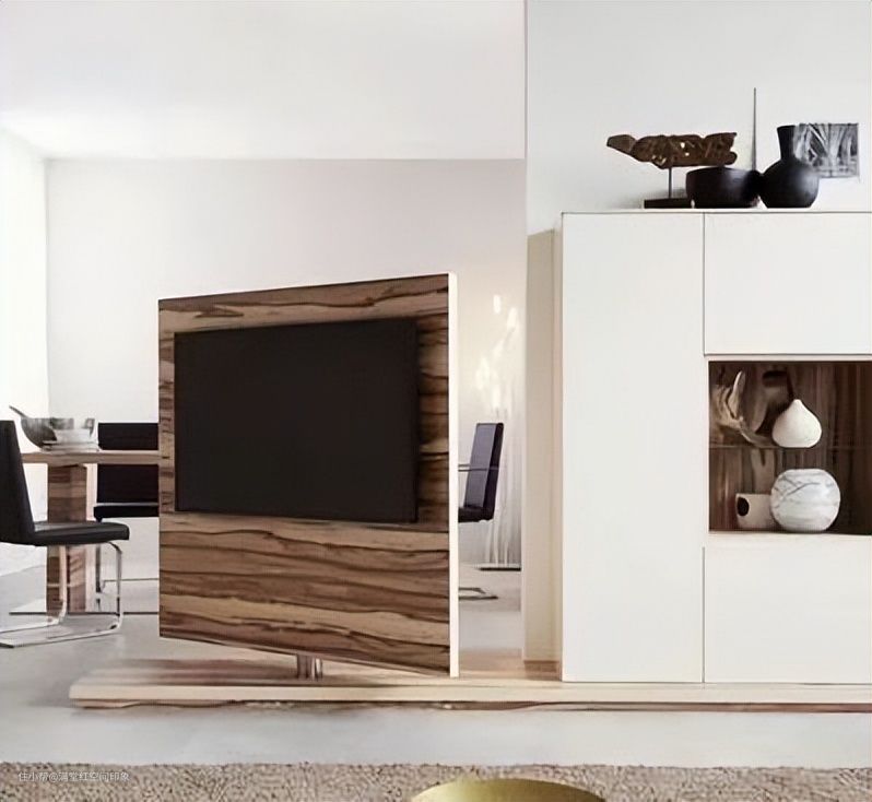 旋转背景墙一开始最常用在酒店,这种电视墙不仅具有普通电视墙的功能——安放电视、分割区域、遮挡视线、储藏收纳等,更重要的是,它可以进行正反面的旋转。也就是说,仅用一台电视,就可满足两个区域的电视使用需求,是不是非常划算?
