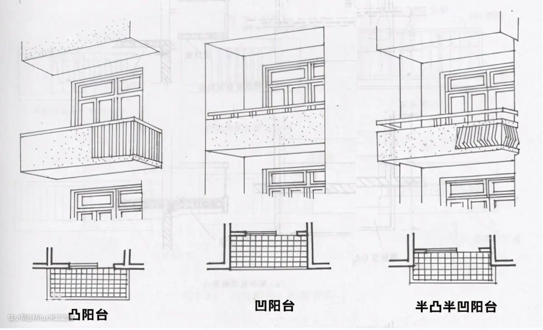一般来说主要是三种:凸阳台、凹阳台、半凸半凹阳台