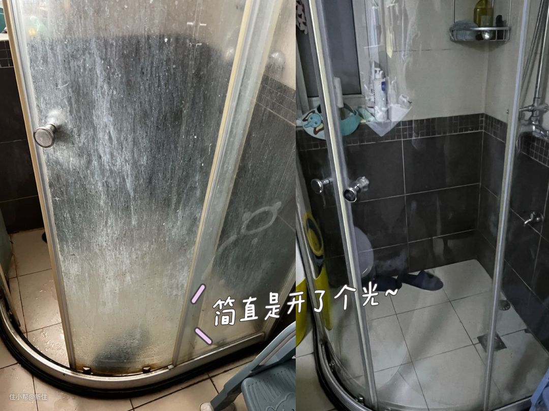 新住小tips:对于玻璃隔断的水垢问题,建议用水垢清洁剂,喷在上面,静置一两分钟花洒冲干净即可。