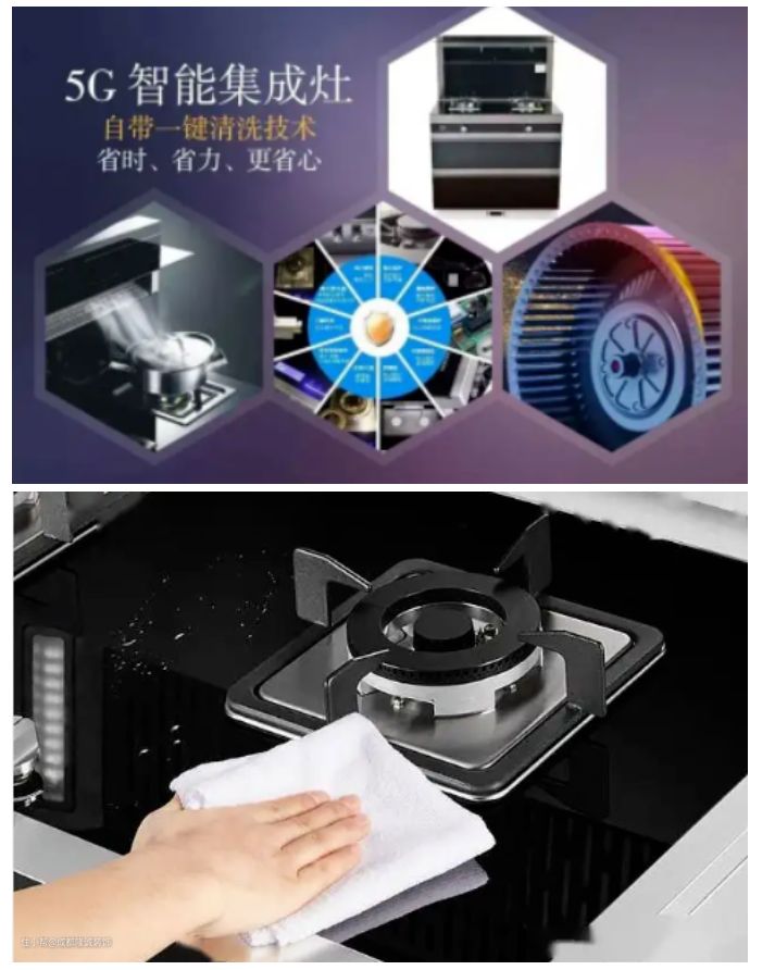 集成灶吸烟口距离近灶台近,且吸力强,极大程度解决了厨房其他区域油烟附着成垢情况,减轻了厨房区域清洁工作量;且集成灶有烟灶联动模式,只要开火,自动启动油烟机进行吸烟;使用完之后,油烟机还可以通过100℃高温加热,溶解油污,通过高速旋转甩掉内机上附着的油污,轻松实现清洁。