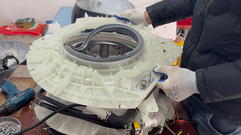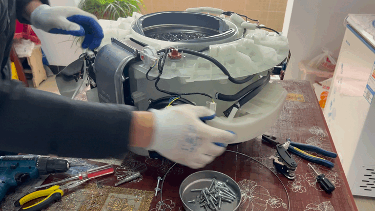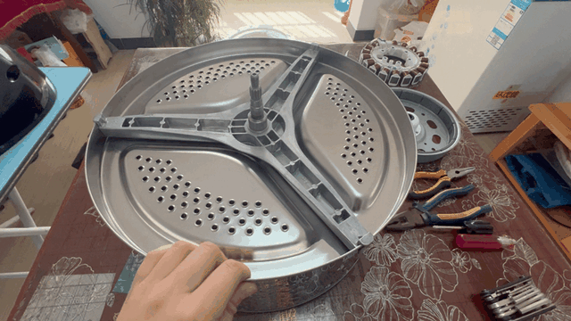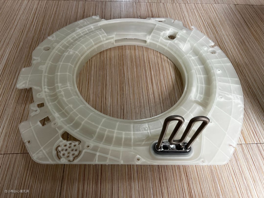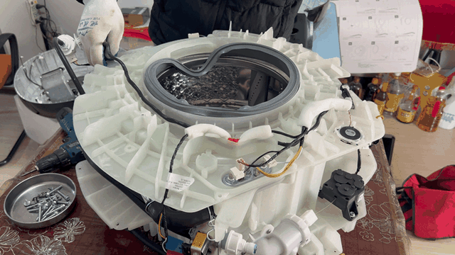 ▲外壳、电机、管线都剥离完后,剩下的就是整个壁挂洗衣机的内外筒部分。