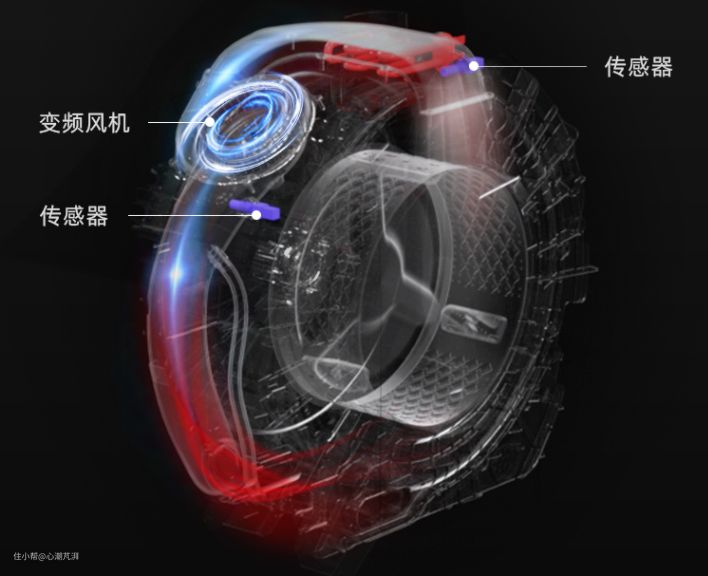 烘干模块:主要作用是衣物的烘干作用,主要包括变频风机、加热管、传感器、风道等。