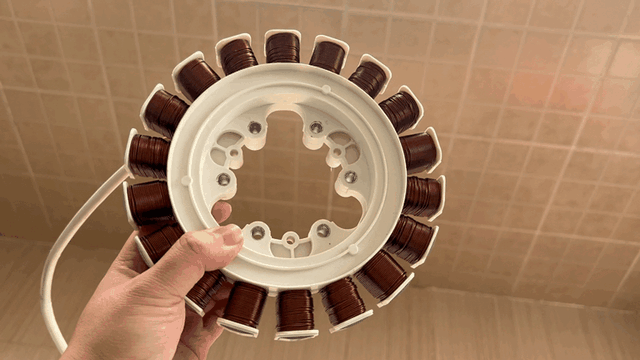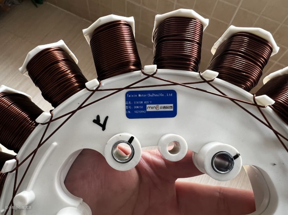 ▲定子端的绕线工整,铜线也比较粗,铜线的粗细能够反应可以承载电流的大小。铜线越粗,能够承载的电流就越大,能够经受的负载也就越大,动力也会比较强劲。