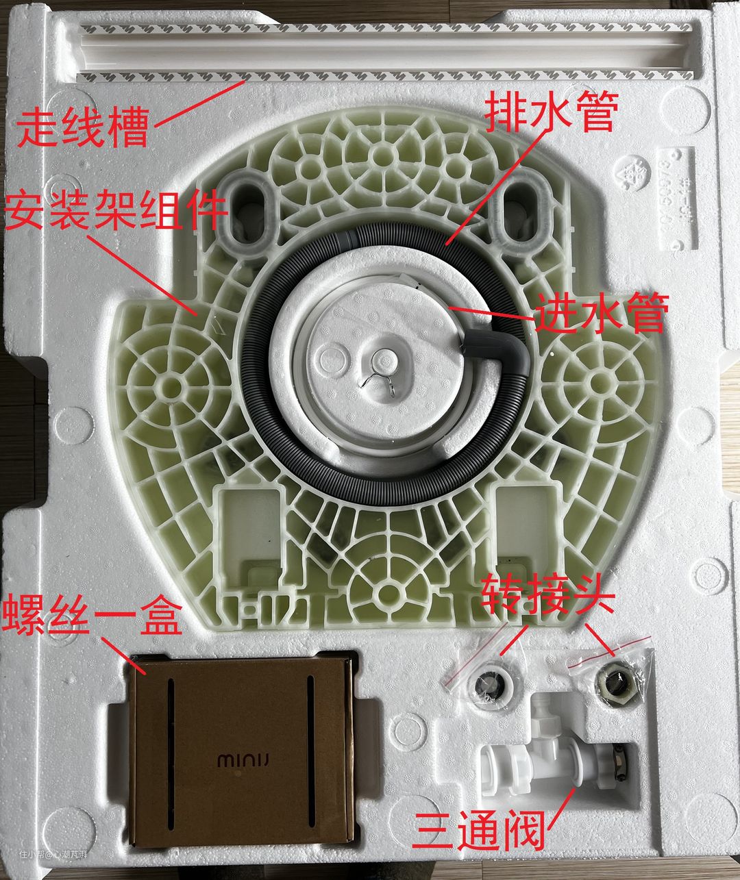 ▲图纸的背面为安装示意图。包装的第一层为安装架组件、排水管、进水管、螺丝一盒、三通阀组件、进水口转接头、使用说明书、走线槽等。