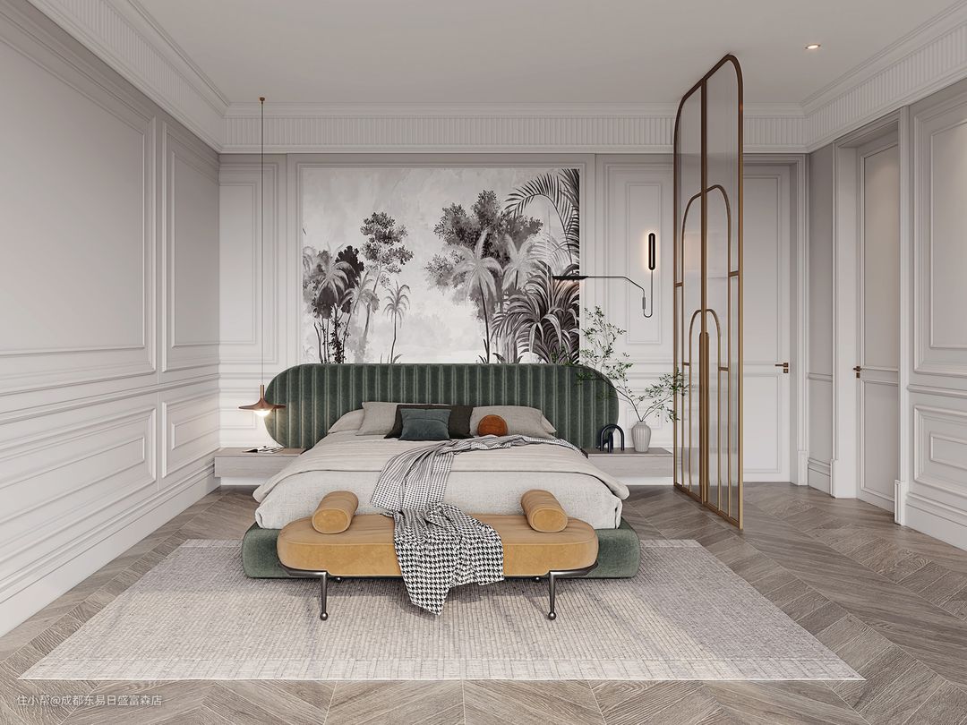 二层搭建了一部分,增加一个主卧套房,美式家居的卧室布置较为温馨,作为主人的私密空间,主要以功能性和实用舒适为考虑的重点,一般的卧室不设顶灯,多用温馨柔软的成套布艺来装点,同时在软装和用色上统一。