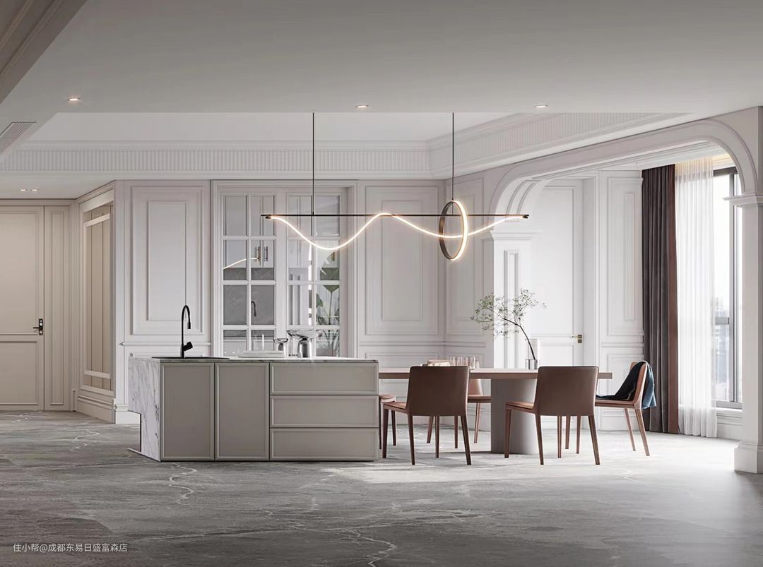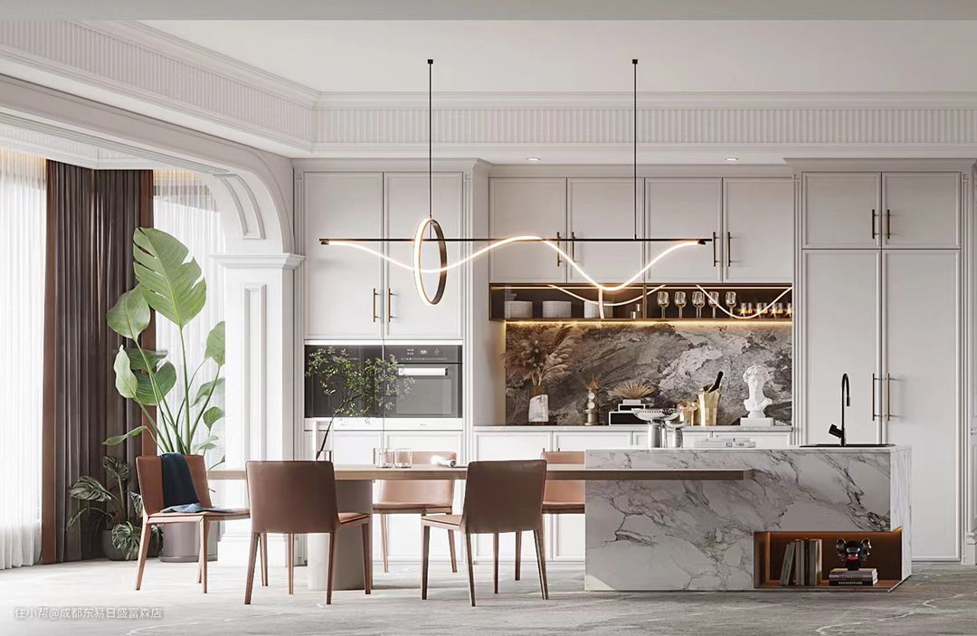 餐厅增加西厨和导台的位置,扩大了厨房的操作空间,也增加了使用功能,导台的存在让厨房和客厅餐厅之间看上去更加有层次感,将空间巧妙的划分开。