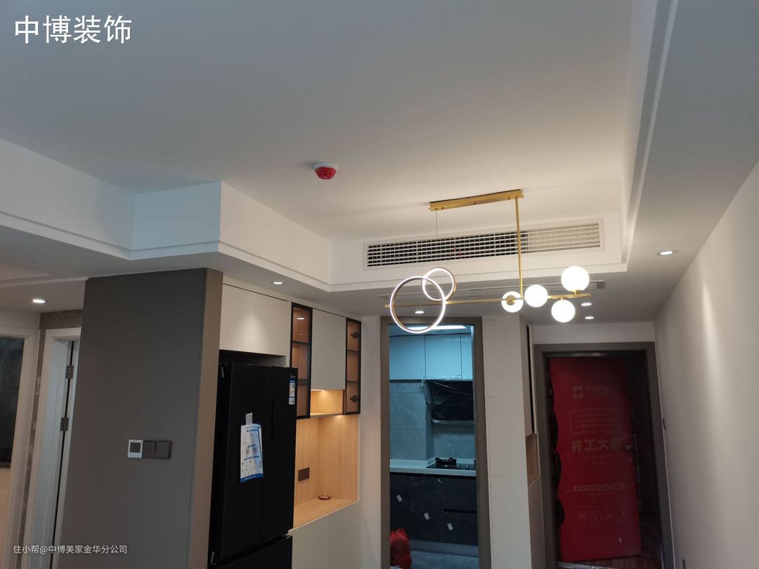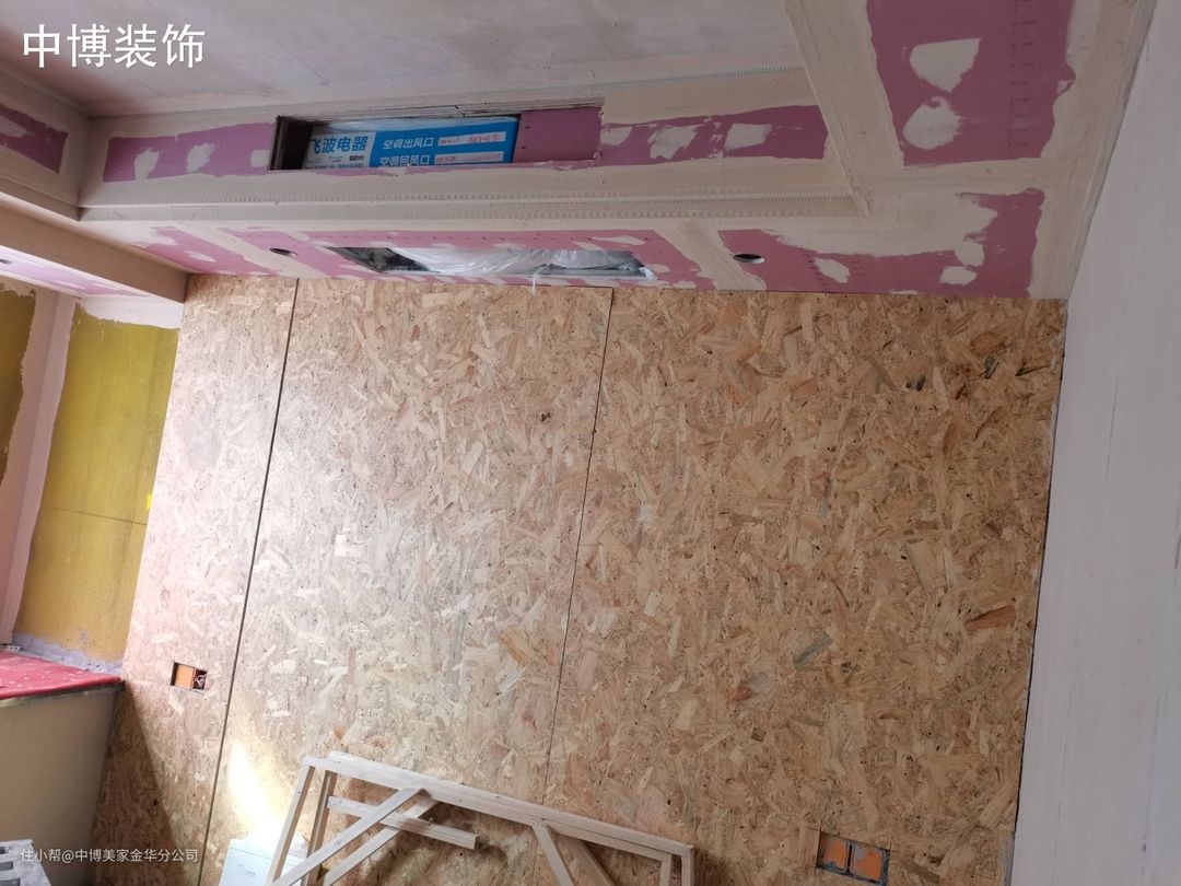1、木工材料进场 2、整体轻钢龙骨吊顶 3、兔宝宝E0级红面石膏板吊顶