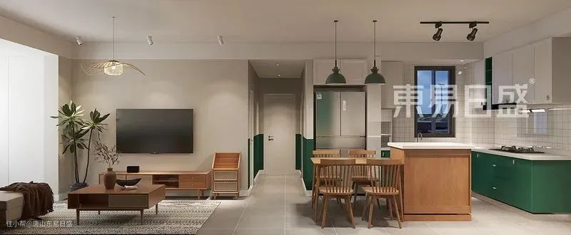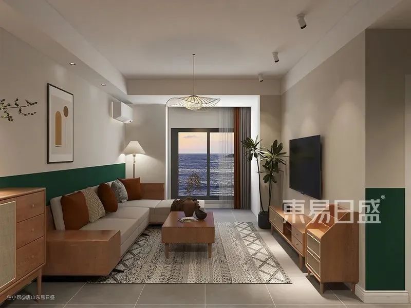 墨绿色墙裙渲染出优雅的空间格调,原木色、奶白、深咖在此交融,传递出自然恬静、又有复古味道的家居氛围。L形布艺沙发搭配木质家具、青翠绿植,再借竹编吊灯的光线加以点缀,让人时刻处于温馨的环境中。