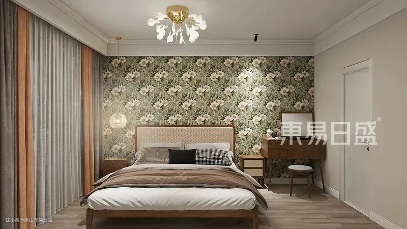 整齐规律的花纹墙面,为宁静的卧室增添几分清新的气息。在明朗的灯光笼罩中,棕灰拼色的窗帘、质朴古典的床头靠背与咖色床品,一同演绎出复古的摩登场景。在雅致的软装中,主人得以卸下疲惫,安稳入睡。