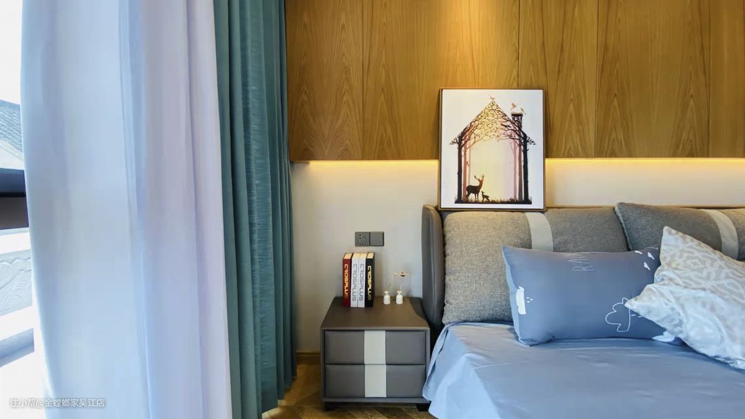 本案客厅木饰面上墙,沙发选用浅色勾勒黑色框架,搭配黑色茶几,古典雅致沉静,书房为开放式,通过沙发进行区域分隔,色彩上选用与木饰面相同的色系,灯具富有古典设计感,与背景墙岩板纹案结合,仿若一幅巨幅山水画。
