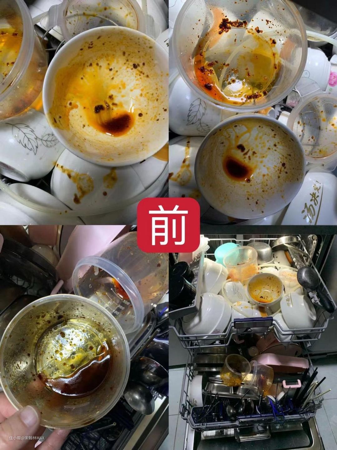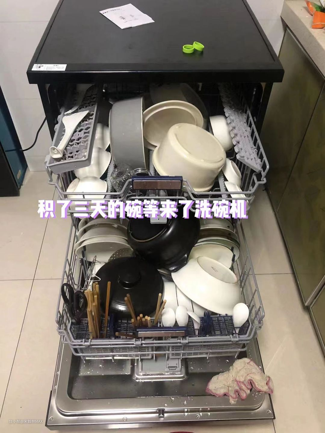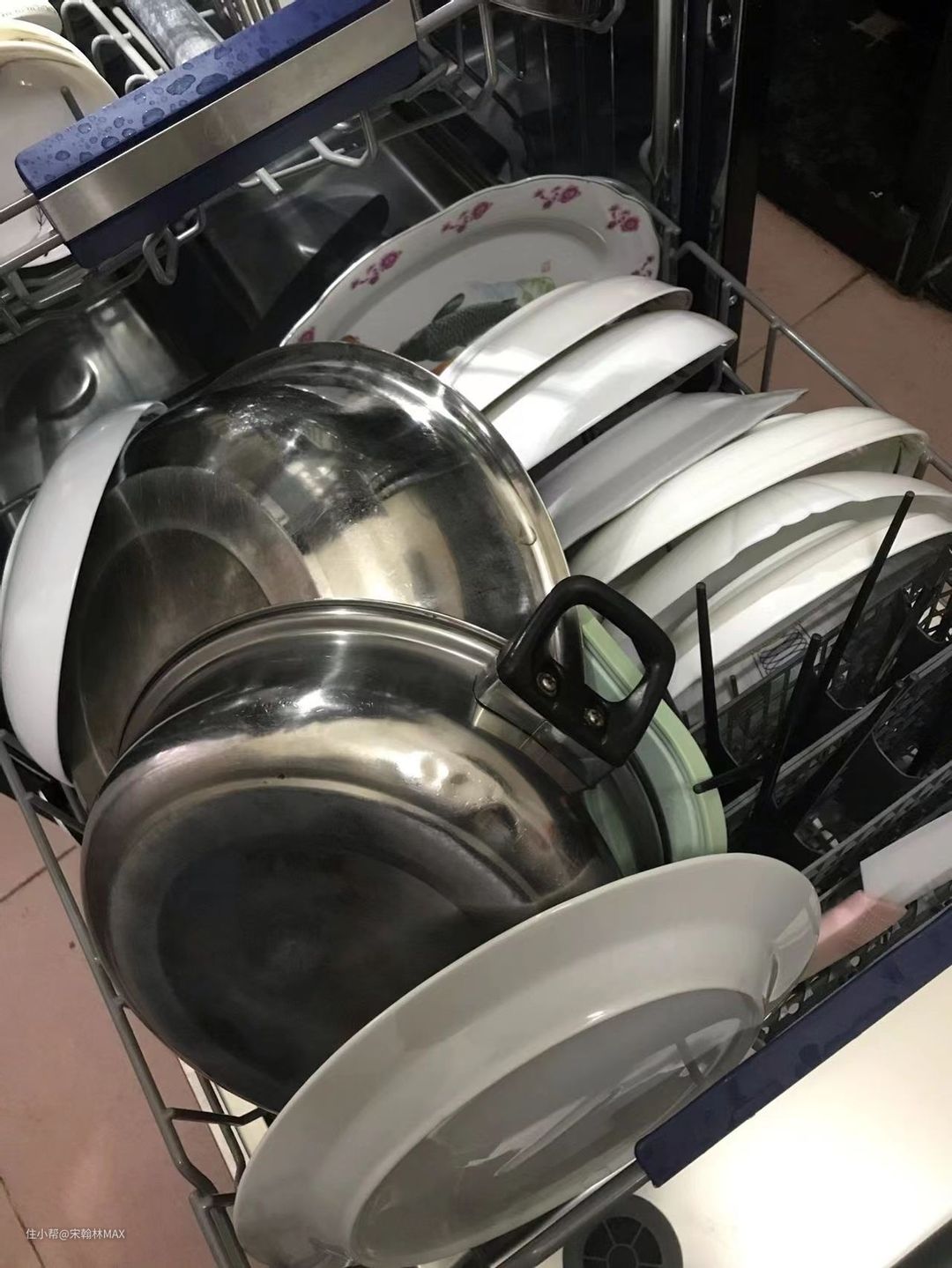 这是我爸妈过来我家的时候,一家五口的碗筷锅,除了电饭锅胆和炒锅有涂层不能放,其他全部塞进去了,想想洗这些锅碗有多累,用洗碗机简直不要太爽。