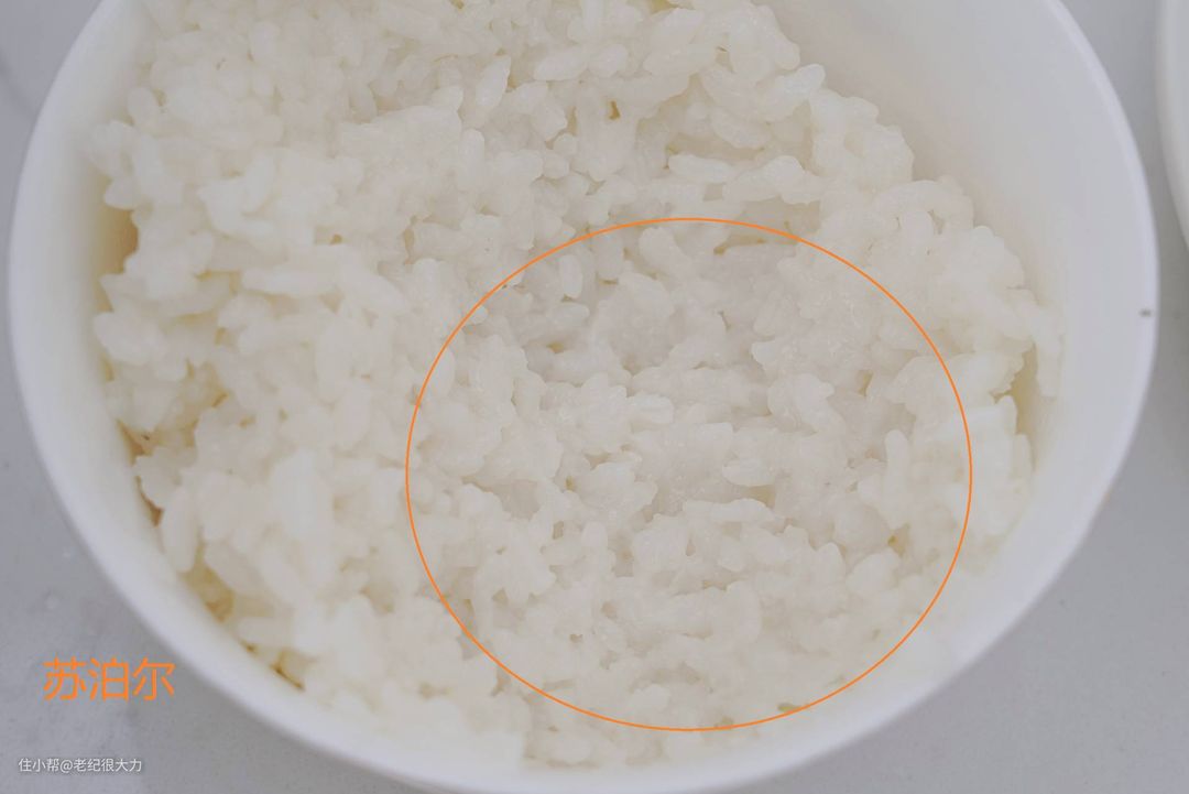 苏泊尔按照官方推荐比例焖的大米饭吃在嘴里特别软,舌头只能感受到一团团的米饭,无法有效分辨每一粒大米。美的添加1.6倍的水做出来的大米饭很硬,苏泊尔按照1.3倍添加的水制作的大米饭则特别软,其中的差别还是蛮大的。