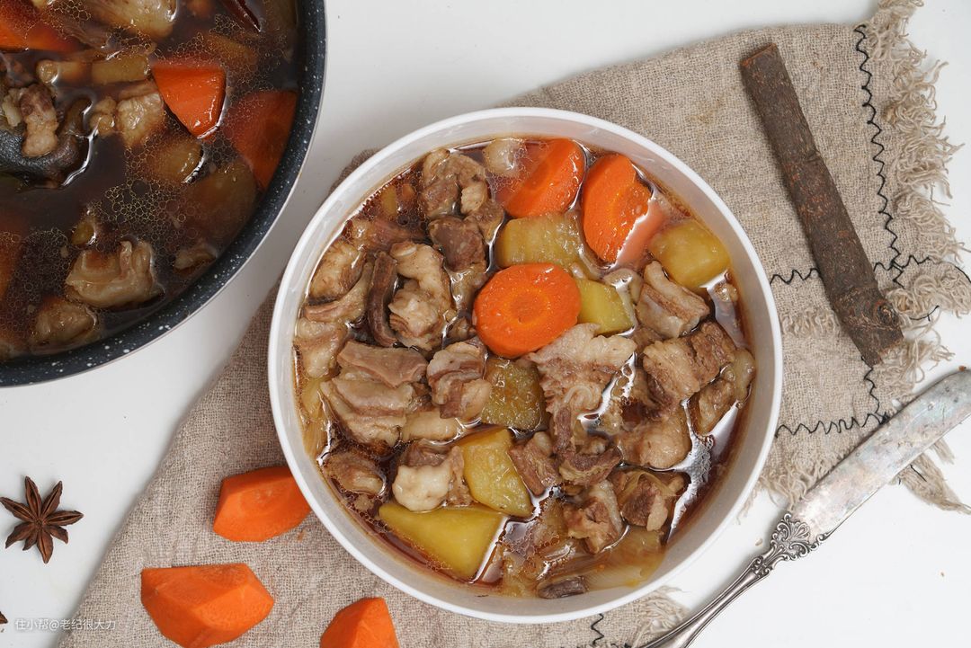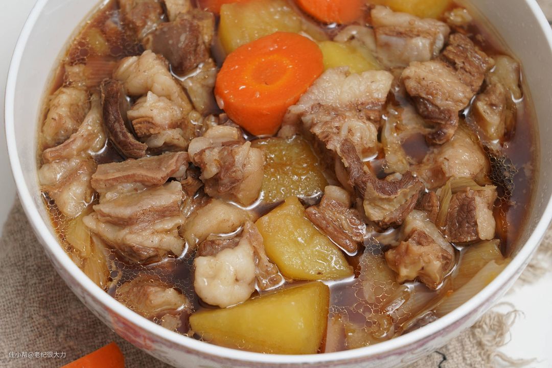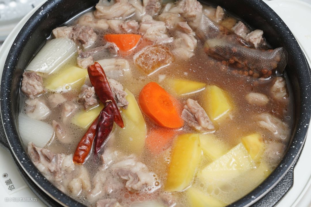 烹饪结束后手动排气(提高烹饪速度),放入提前切块的胡萝卜、土豆块,然后放入15克糖、30克生抽、30克老抽、10克盐(1.3斤牛腩+2个土豆+1个胡萝卜)的量,喜欢吃辣可以放几个干辣椒。