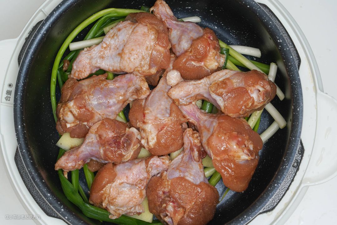 把鸡翅根整整齐齐的摆在葱上盖上盖子