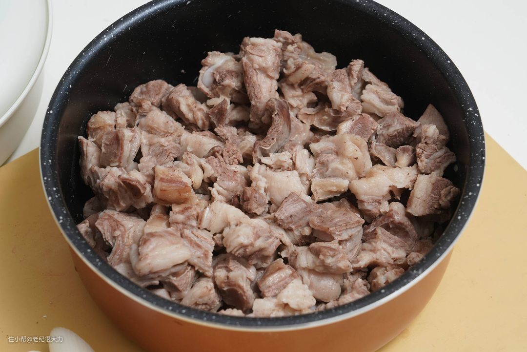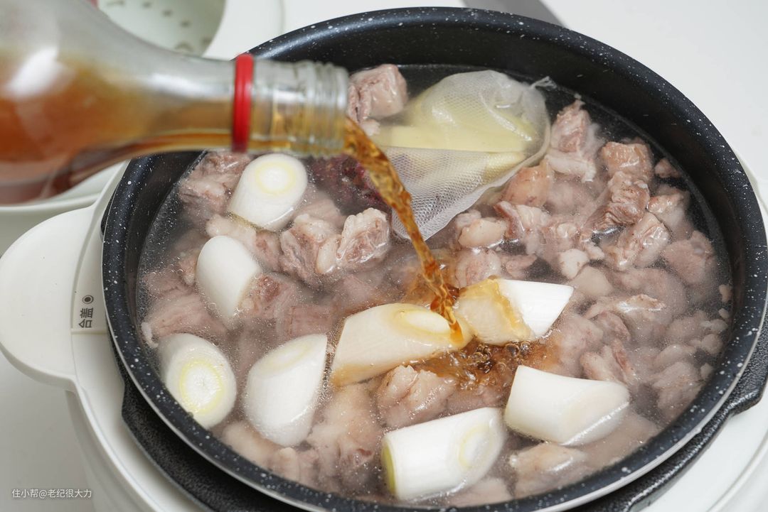 羊肉冷水下锅焯水,水开后去掉血沫,一定要冷水下锅否则血水就被收紧在肉里了,影响味道。把羊肉放在内胆里,这个七彩叮当的锅一次可以压1-1.3斤的羊腩。