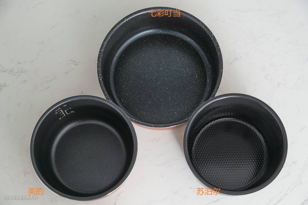 拿掉锅盖看一下。美的和苏泊尔都是2.5L,七彩叮当是3L的,比左右两款略微胖一圈。