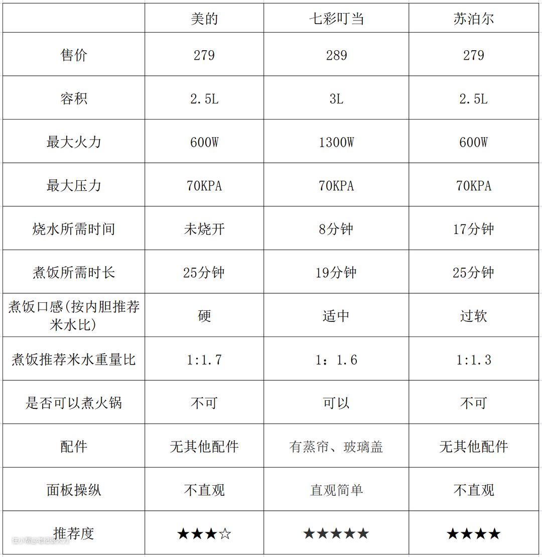 总结:七彩叮当的加热功率最高,烧水、焖饭的速度都快了很多。七彩叮当按照1.6倍米水比煮的饭口感最佳。如果使用美的压力锅,米水比最好在1.75。而使用苏泊尔则最好是1.2,两者都不要使用锅内胆推荐的水米比。