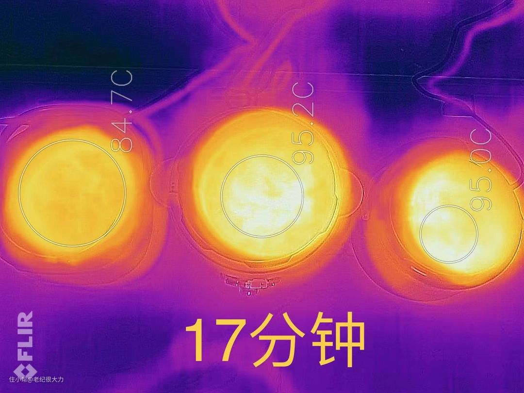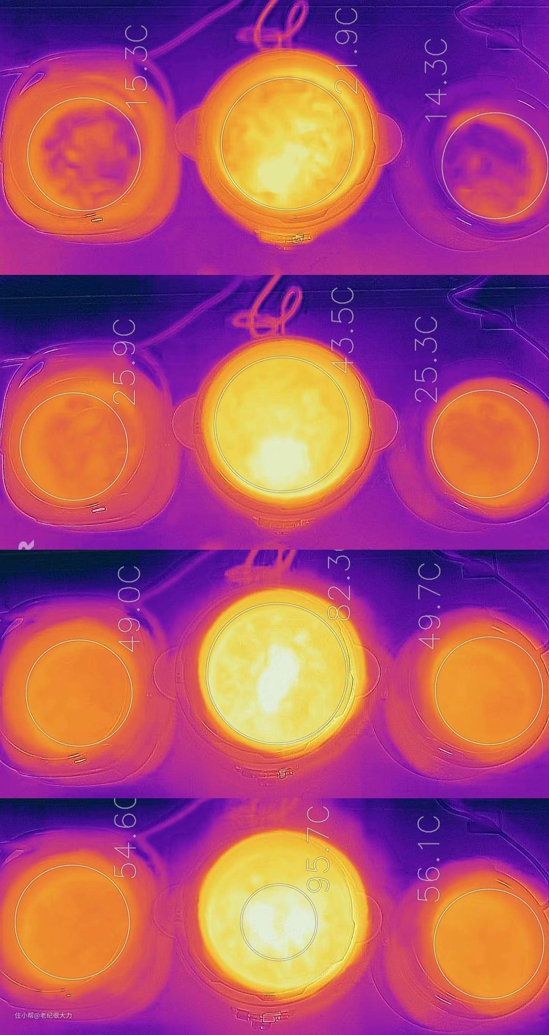 这是热成像下的三款锅的测温图,可以看见从开始不一会,中间七彩叮当的温度就一骑绝尘,领先另外两款锅子。到最后中间的水完全沸腾时(热成像对光滑表面的物体---水测温略有误差),左右两侧都才只有60度左右。