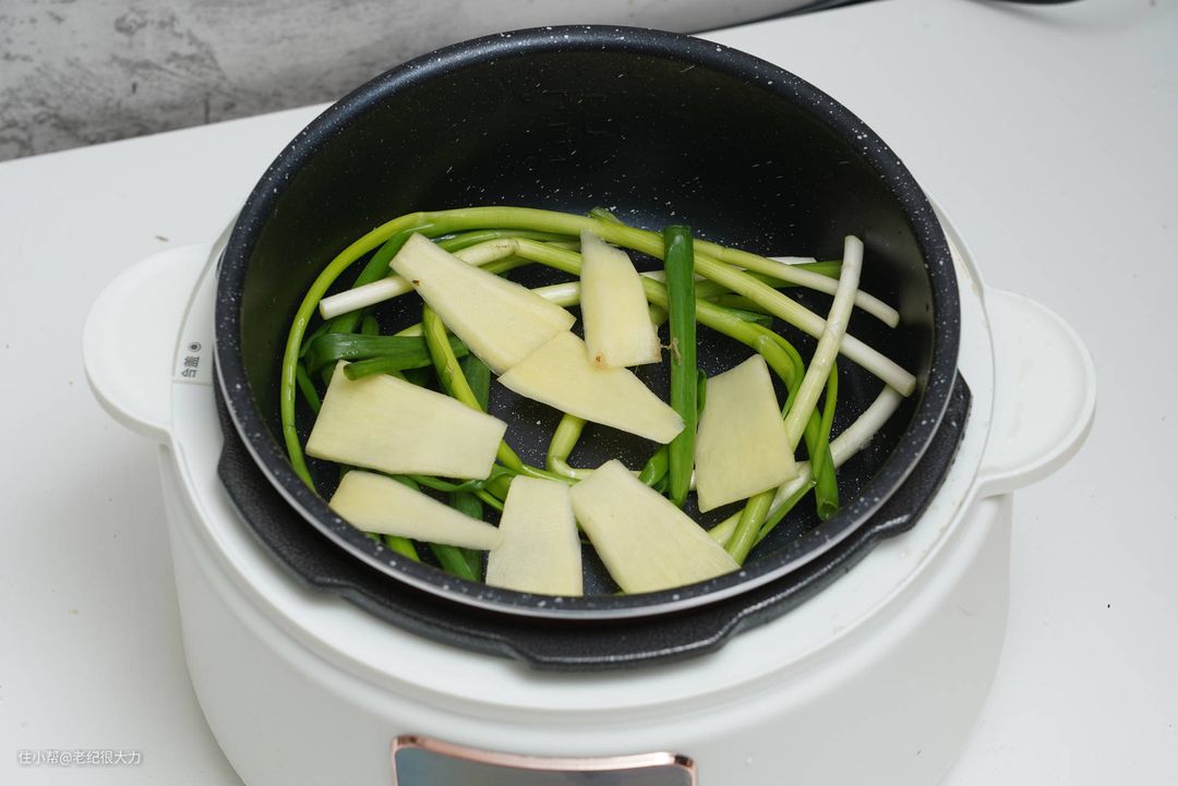 电压力锅里放上一些姜片、葱段用来去除鸡肉的腥味,除此之外不需要任何调料,也不需要加水。