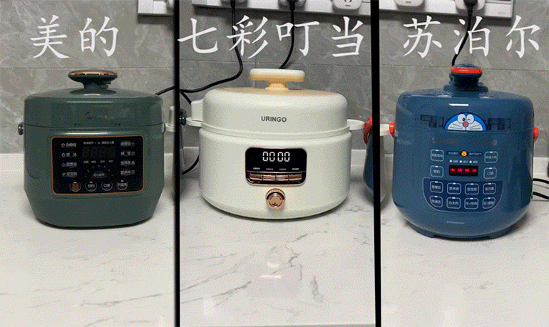 对比环节里三款电压力锅的摆放顺序是一致的,从左至右分别是美的、七彩叮当以及苏泊尔的机器猫联名款。
