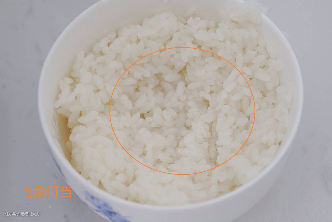 首先看看大米的表层。七彩叮当和苏泊尔的表层大米饭用手摸上去的触感都很柔软,而美的焖点大米饭手摸上去就很硬,就好像煮好饭开盖放了一小时的那种感觉,摸上去是硬的。