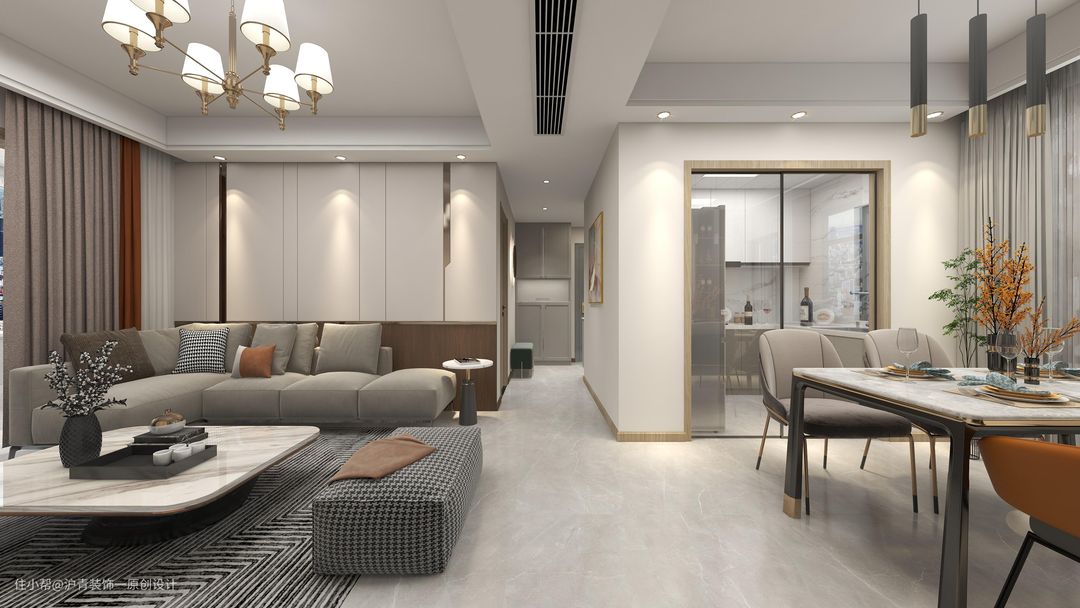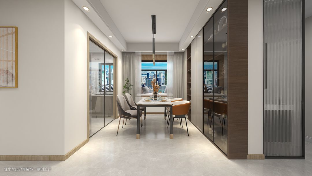 餐厅:餐边柜设计了整面门板,整体更加简约稳重, 部分门板搭配极窄边框玻璃门板,更加现代,餐桌上方安装了金属线形吊灯 ,提升吃饭的幸福感。