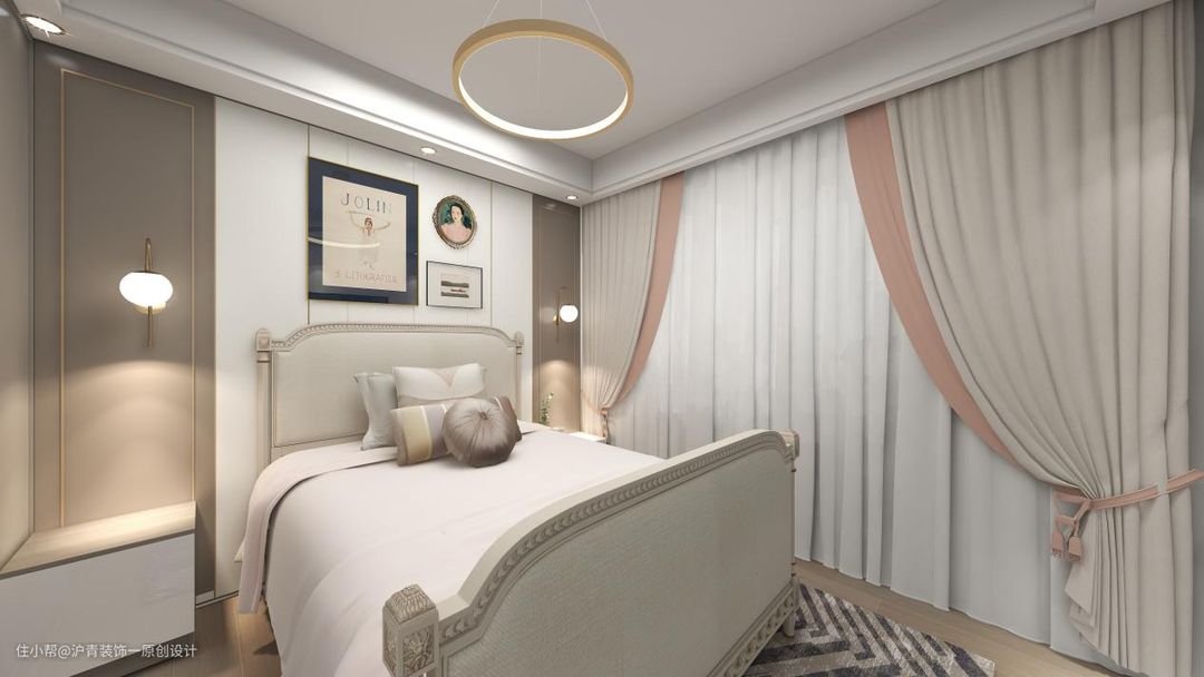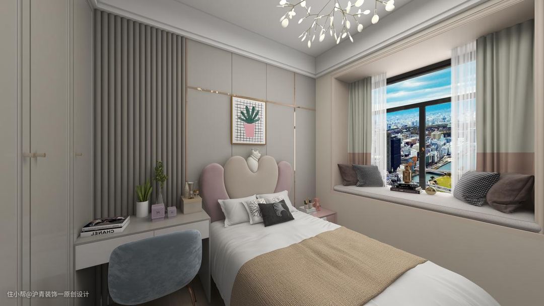 客房:床头搭配硬包背景墙,整体空间更加稳重简约,飘窗凹陷处设计了一组展示柜,增加储物空间