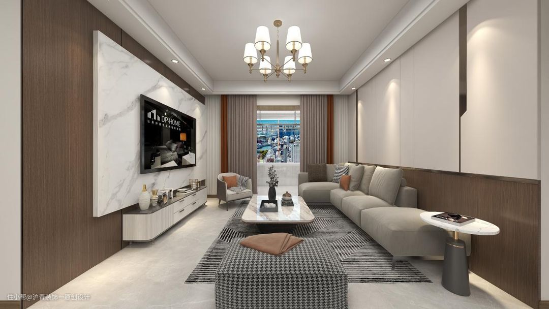 客厅:沙发背景设计了硬包结合木饰面和电视背景墙的岩板木饰面和谐统一。