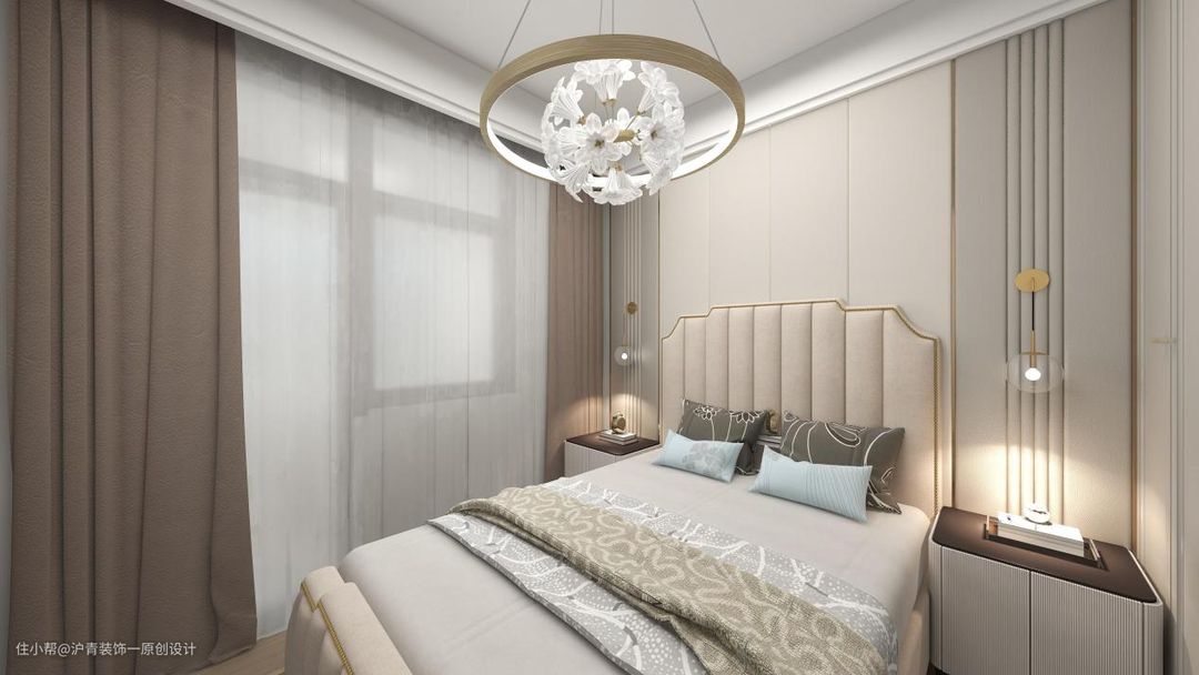 主卧整体格调素雅简约,床头背景墙搭配硬包和金属条,两边壁灯让空间更加灵动与轻松