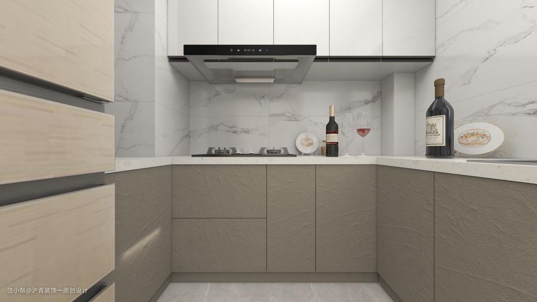 厨房: 厨房浅色的爵士白瓷砖搭配暖灰色厨柜整