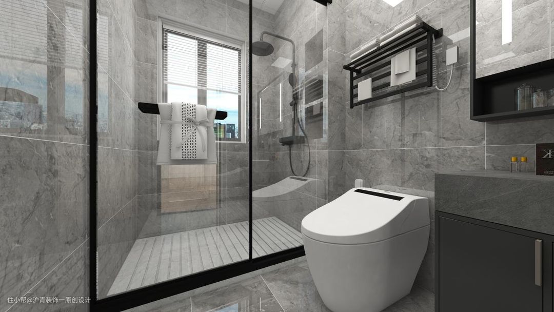 卫生间:卫生间墙面整体设计了灰色瓷砖,湿区设计了防滑石,加快湿区排水以及起到防滑的作用。