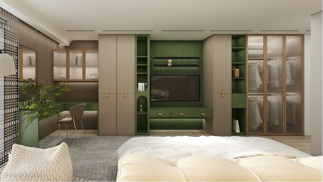 图5竹青色与雅灰色错色,搭配金丝窄边框玻璃门,极具养眼的清新雅致感;衣柜与电视柜、书柜组合,镂空门型点缀出空间的趣味,局部打造格栅背景墙温润自然。